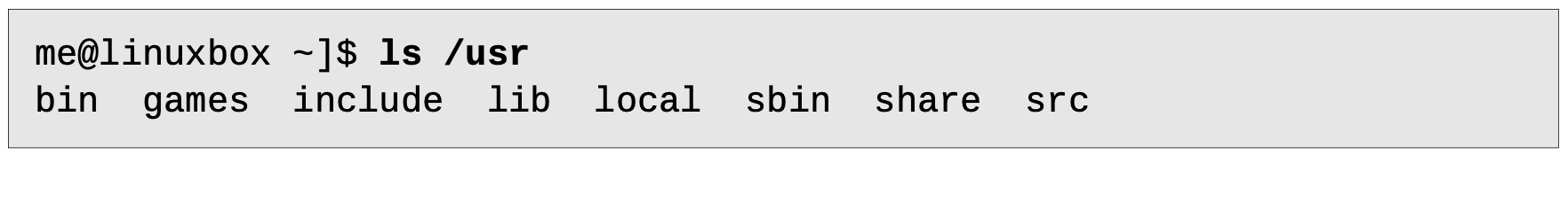| /usr/local | 배포판에는 포함되어있지 않지만 시스템 전반에서 필요한 프로그램들이 설치되는 공간입니다. 컴파일된 실행 파일은 주로 /usr/local/bin에 저장됩니다. 새로 설치된 리눅스 시스템에는 이 디렉토리가 존재하지만 시스템 관리자가 직접 소프트웨어를 설치하기 전까지는 비어있습니다. |